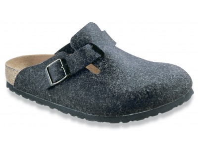 The classic Birkenstock clog in anthracite wool with adjustable strap and shock absorbing EVA sole. The Birkenstock footbed is made from cork & latex and is covered in a fine suede liner. Features include pronounced arch support and a deep heelcup for maximum support.
