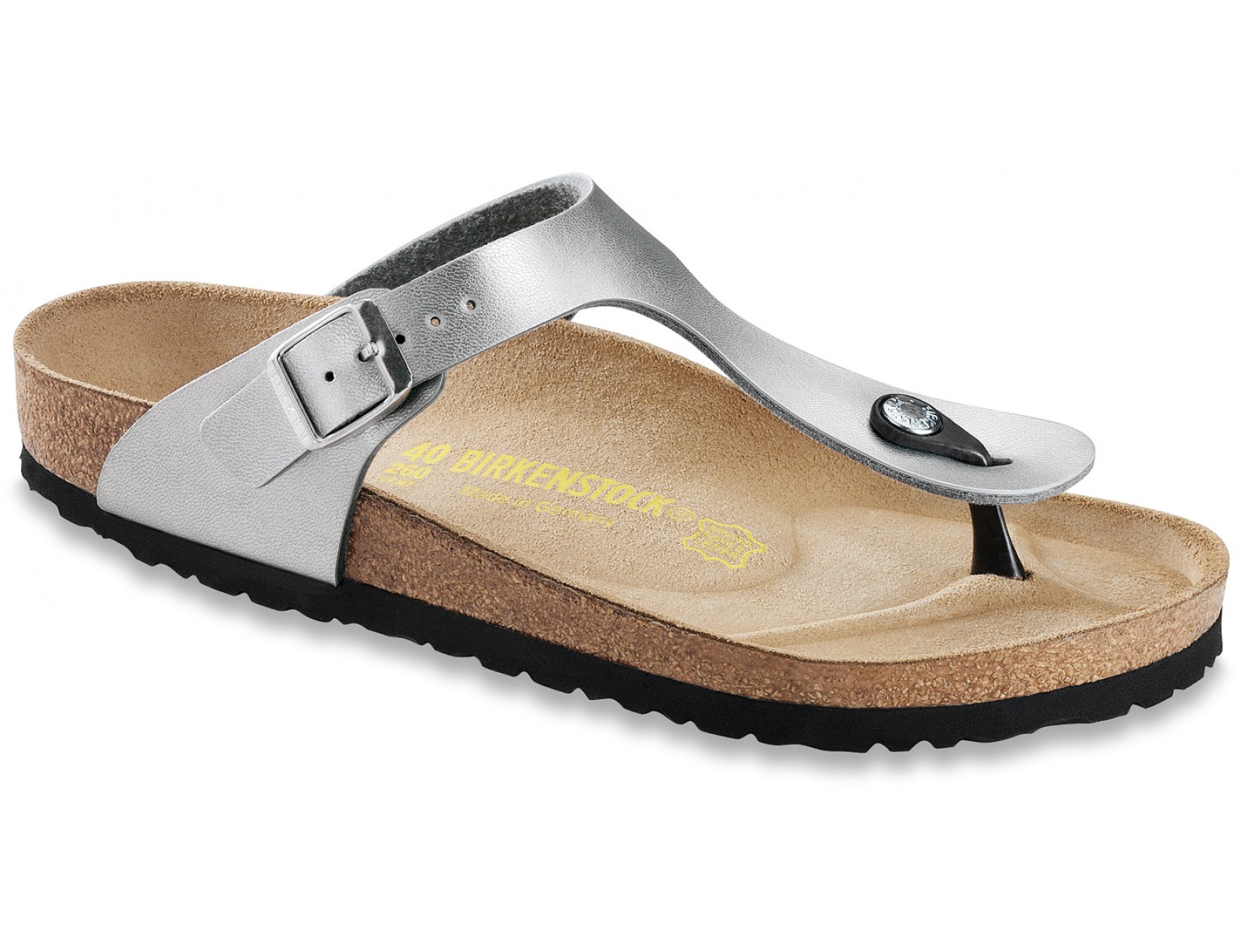 The classic Birkenstock thong sandal in silver birko-flor, with adjustable strap and shock absorbing EVA sole. We recommend the Gizeh model in the regular width for all foot types. The Birkenstock footbed is made from cork & latex and is covered in a fine suede liner. Features include pronounced arch support and a deep heelcup for maximum support.